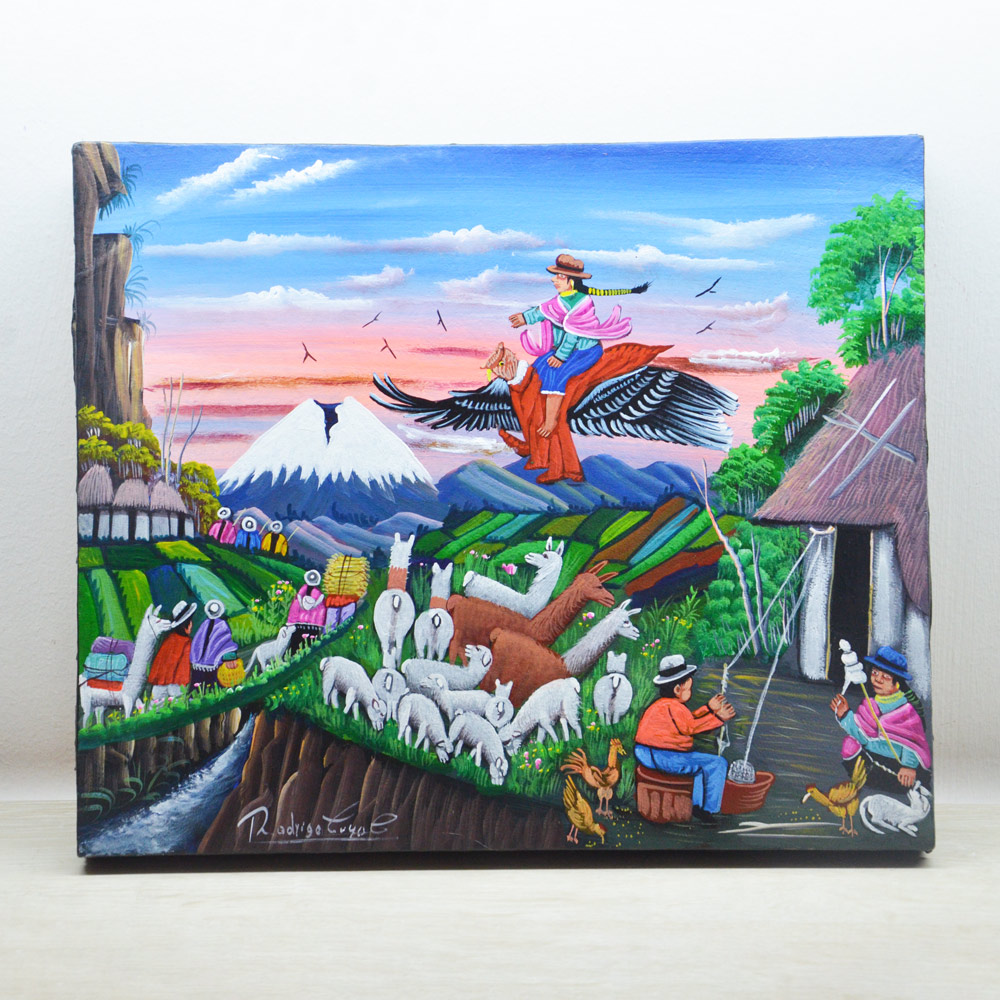 Cada escena representa paisajes vibrantes, episodios de la vida comunitaria y mitologías ancestrales, ejecutadas con una técnica única que ha sido transmitida oralmente por generaciones. Este arte naif combina magical realism con una paleta de colores intensos que reflejan la cosmovisión andina y su profunda conexión con la naturaleza.